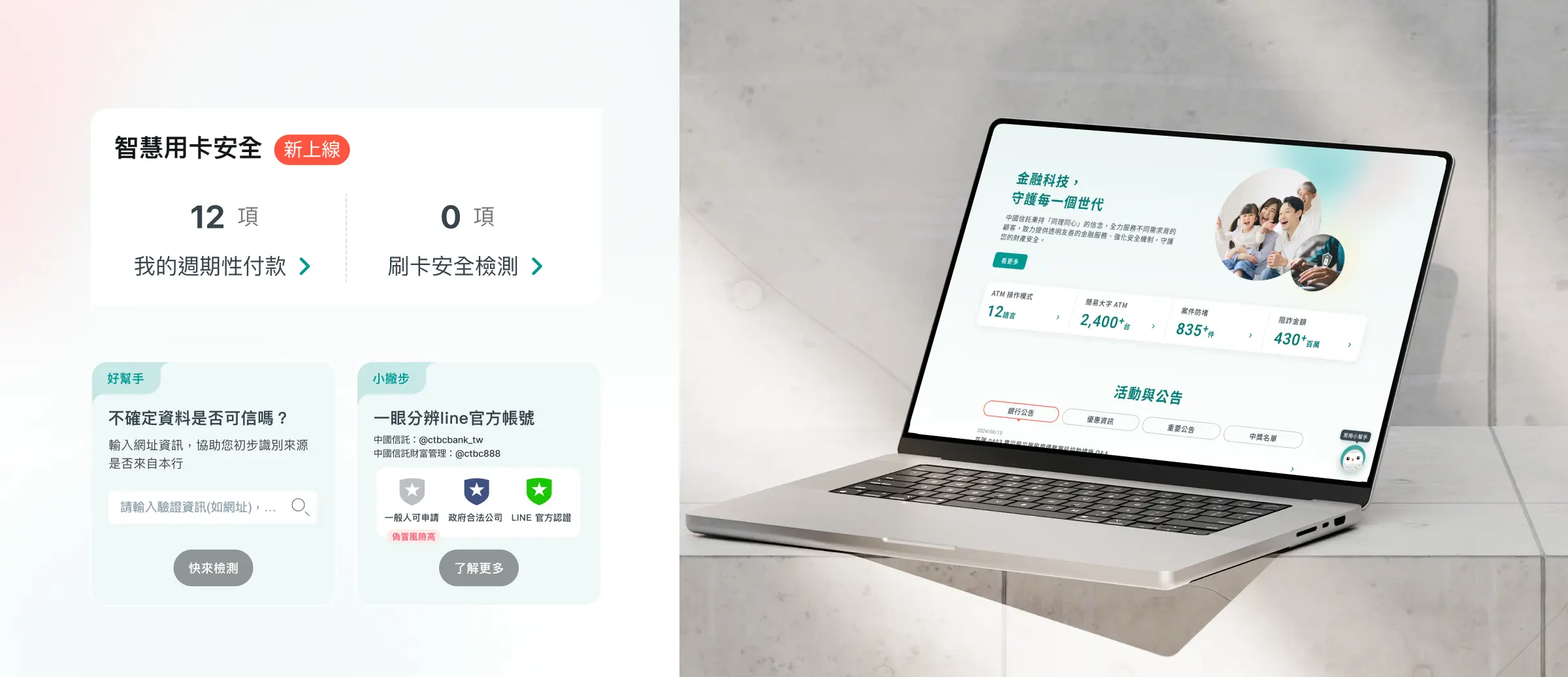 隨著用戶金融行為日趨多元,中國信託積極推動數位轉型,期望以一致、具識別度的品牌體驗,讓服務更融入用戶日常。然而,現行平台在視覺語言與使用引導上仍有挑戰:官網與 App 的品牌延伸不足,產品版型單一不利於推廣, Line 官方帳號定位模糊、流量轉換受限。為此,中信攜手果思,針對官網、App、Line 三大平台重構品牌風格、調整引導設計,提升整體服務架構的一致性。期待打造更聚焦、更具流動感的數位體驗。