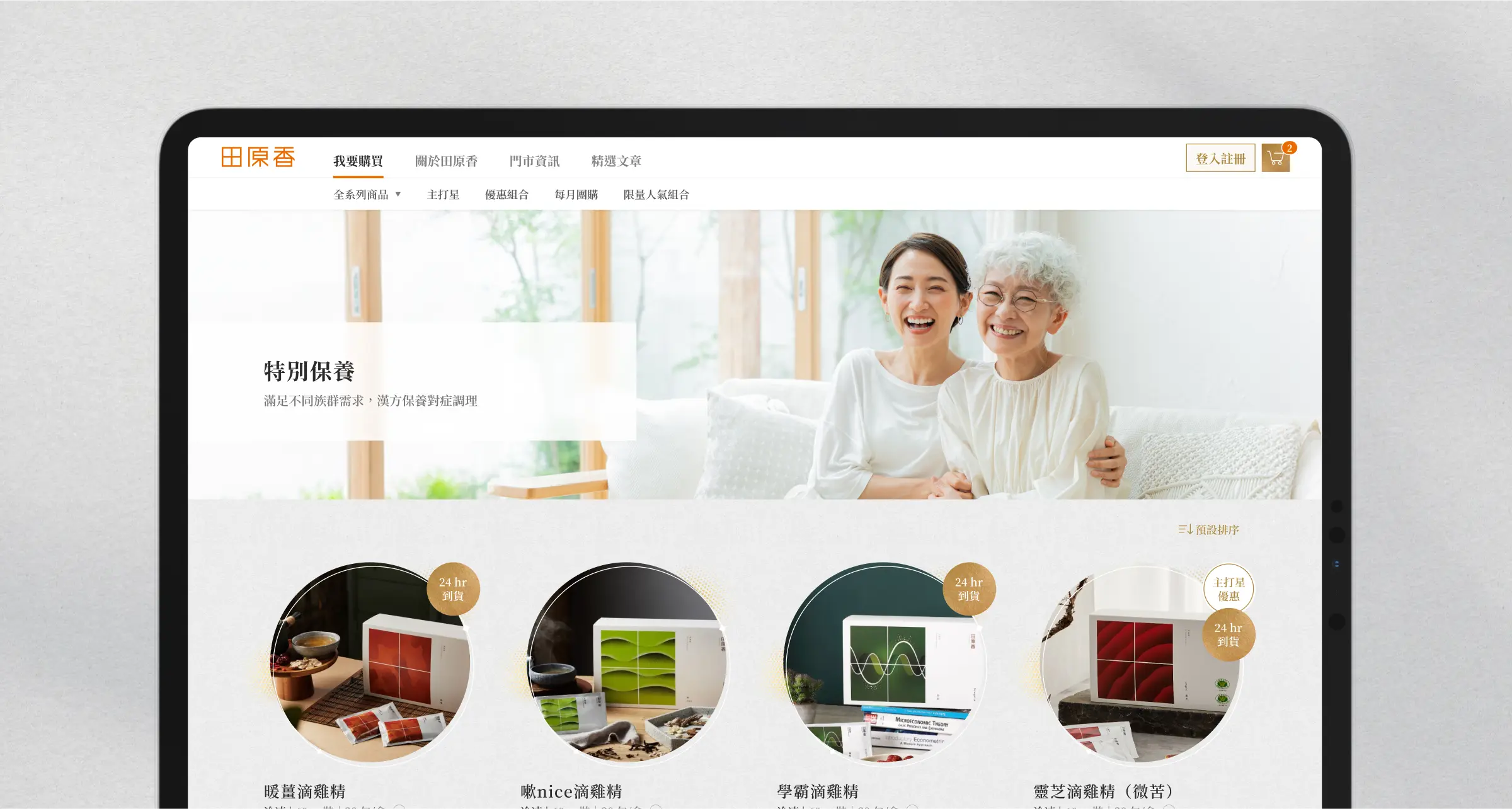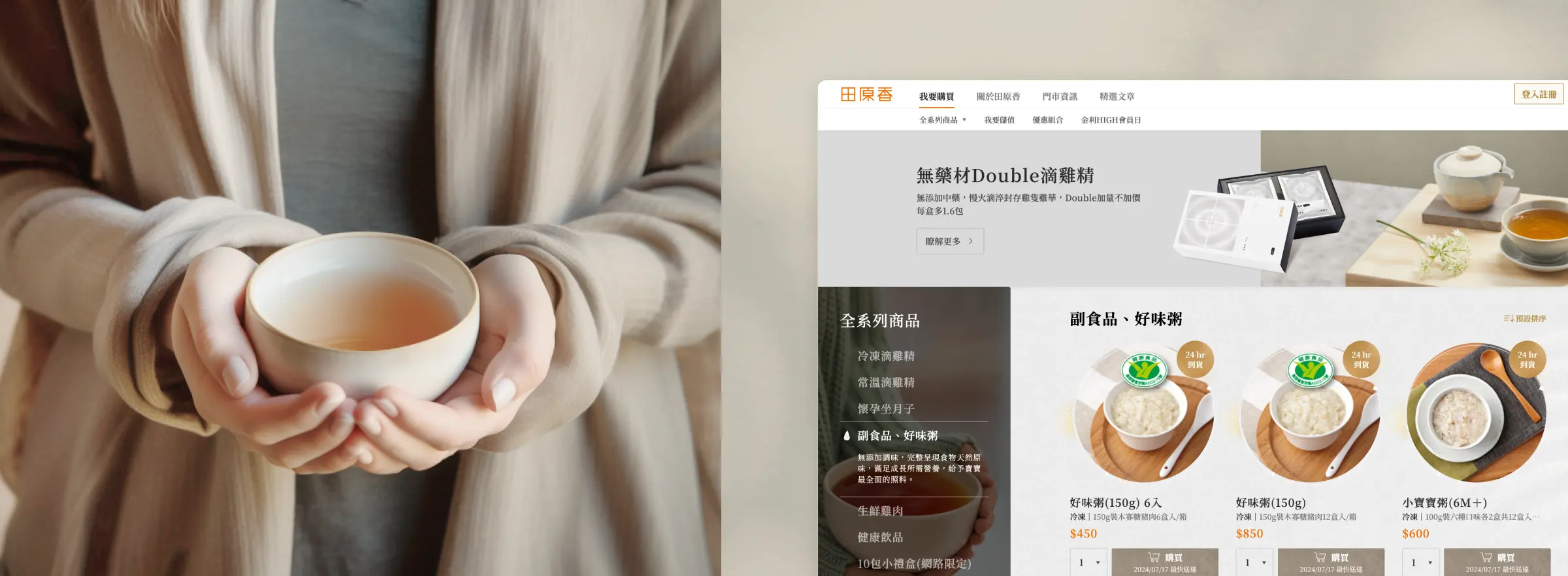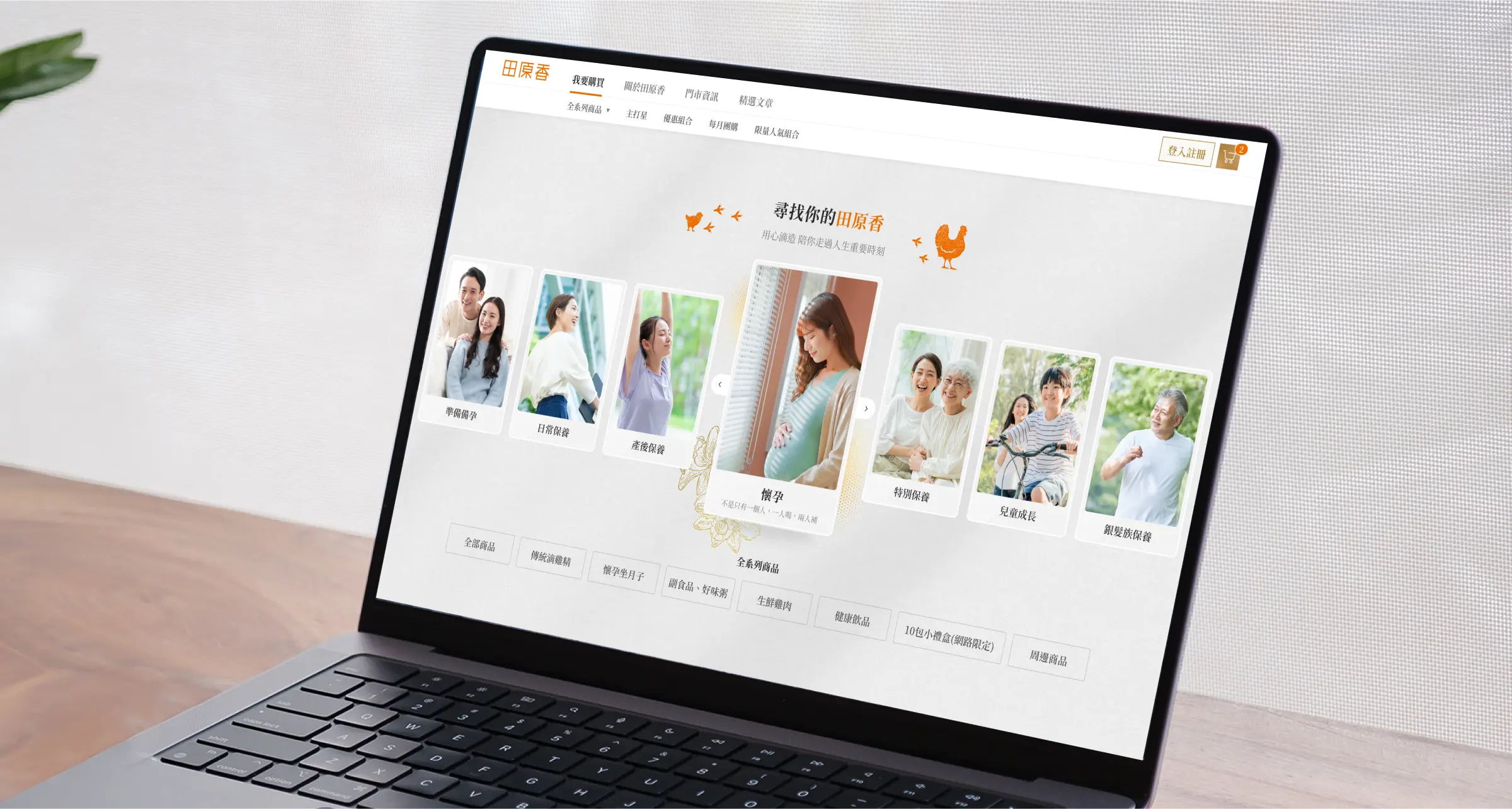 田原香以「因人而異」的中醫理念,推出多款漢方藥材滴雞精,作為品牌獨有的特色。並針對不同族群、生活型態和人生階段,提供多元的調理方式。然而,各通路溝通銷售方式缺乏一致性,品牌特色難以傳遞。本次改版,果思聚焦田原香的產品特色和理念,透過以「族群」切入的商品分類方式及策展頁,突顯差異化;並輔以漢方藥材、自然材質的設計細節,為原先冰冷的線上銷售場景中,注入田原香溫暖、具生機的特色。